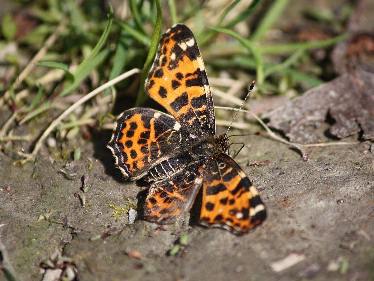 Die Falter der Frühlingsgeneration sind kleiner als jene der Sommergeneration. Die Falter zeigen auf der Flügeloberseite eine bräunlichrote bis orangefarbene Grundfarbe, die mit schwarzen Flecken durchsetzt ist. Um die Spitzen der Vorderflügel befinden sich weiße Flecken. In der Submarginalregion befindet sich ein blaues Fleckenband. Damit ähnelt die Flügeloberseite jener der Schecken- und Perlmutterfalter.